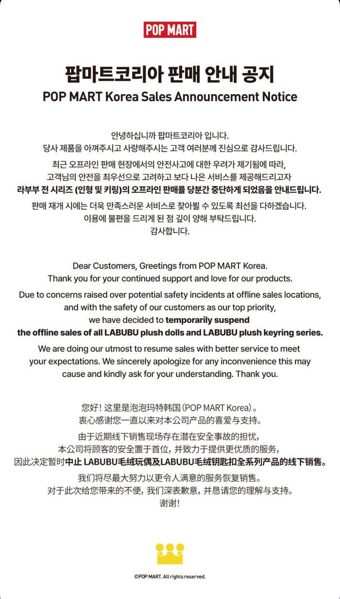 每经AI快讯,6月14日,泡泡玛特韩国发布公告称,由于近期线下销售现场存在潜在安全事故的担忧,公司决定暂时中止LABUBU毛绒玩偶及LABUBU毛绒钥匙扣全系列产品的线下销售。公司将尽最大努力以更令人满意的服务恢复销售。